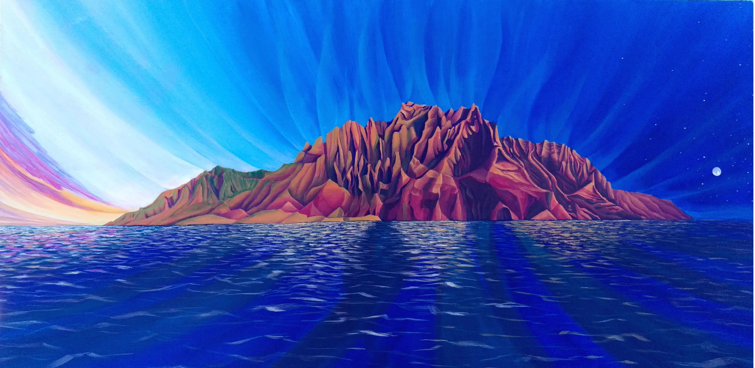 Another gorgeous day. From our studio window, I can see the jagged peaks of the Napali Coast to the North. Those mountains, unlike any I've ever seen, rise almost vertically, thousands of feet from crystal clear waters below. Kauai is estimated to have arisen from its volcanic womb over 5 million years ago, making it among the oldest of the Hawaiian Islands. Fierce erosion has since created these majestic spires all along the North Shore, famous for surfing and the truly epic Kalalau trail. This is the first painting I've started (and now nearly completed) since my arrival here. It aims to capture the essence of this wild shore, the incredible energy that flows through the island and the stunning sunrises and moonsets I've been fortunate to witness following evenings I don't stay up way too late painting.